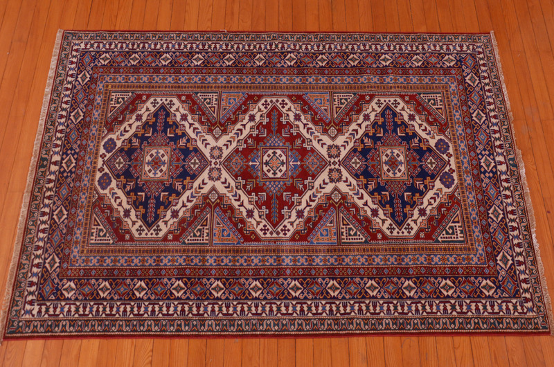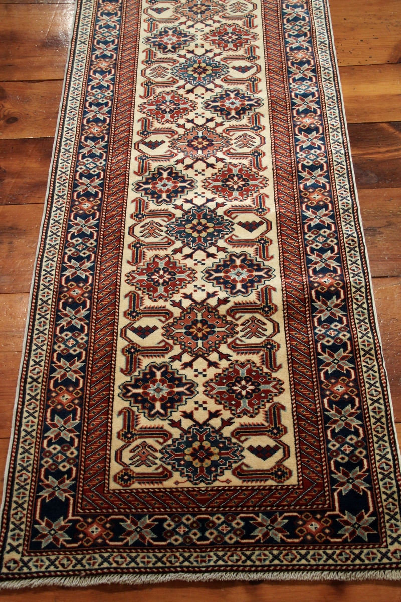 Shairwan rugs are essentially Kazak style rugs in terms of pattern, but they are made with wool spun by a spinning wheel. With this more consistent hand-spun wool, finer patterns are produced and hence Shairwans sport a higher knot count than Kazaks.