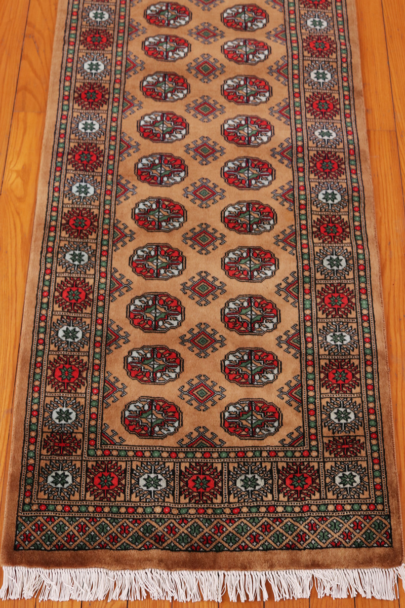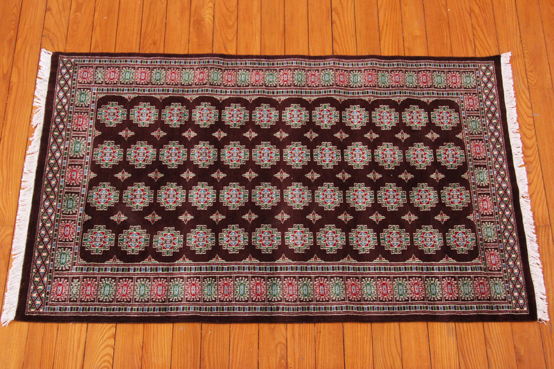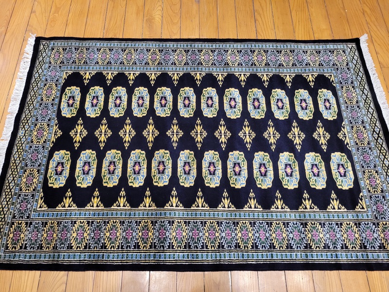 These rugs have fine traditional geometric patterns on solid background colors, generally in jewel tones. They tend to have velvety, plush piles and are very pliant (almost blanket-like) in texture. They are part of a very long tradition and heritage in various parts of Pakistan such as Multan, Kashmir, Hyderabad, Lahore and surrounding areas of the northeast region.