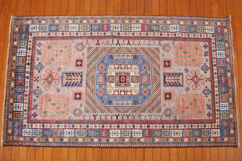 Kazaks are known for their indigo blues, reds and ivories, as well as their casual and warm appearance. Our Kazak rugs are almost entirely naturally-dyed, however, Kazak natural dyes are commercially farmed natural dyes (such as indigo and cochineal) and are therefore less labor intensive for our artisans than hand-gathered natural dyes. The reason for the phrase "almost entirely naturally-dyed" is because some artisans choose to augment their natural dyes with some commercially-available dyes in order to create the precise color they desire. The wool in Kazaks, like the wool found in Chobis and Gabbehs, is hand spun using a drop-spindle.