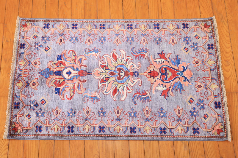 Kazaks are known for their indigo blues, reds and ivories, as well as their casual and warm appearance. Our Kazak rugs are almost entirely naturally-dyed, however, Kazak natural dyes are commercially farmed natural dyes (such as indigo and cochineal) and are therefore less labor intensive for our artisans than hand-gathered natural dyes. The reason for the phrase "almost entirely naturally-dyed" is because some artisans choose to augment their natural dyes with some commercially-available dyes in order to create the precise color they desire. The wool in Kazaks, like the wool found in Chobis and Gabbehs, is hand spun using a drop-spindle.