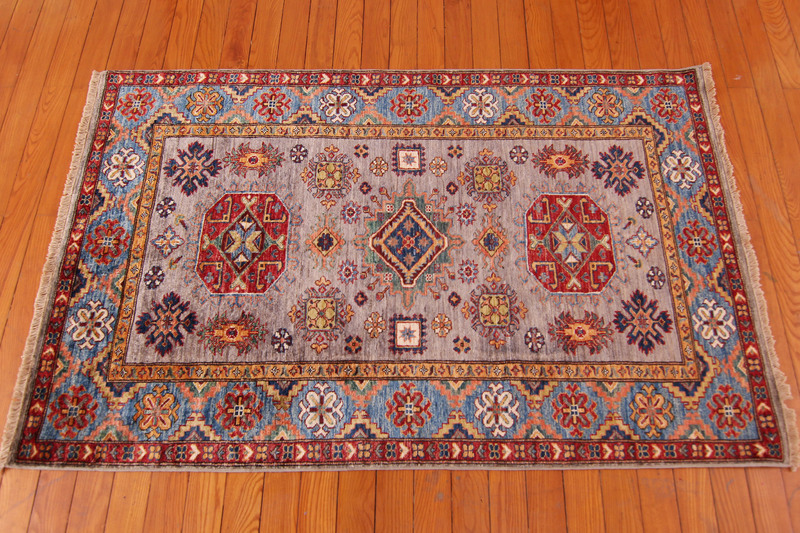 Kazaks are known for their indigo blues, reds and ivories, as well as their casual and warm appearance. Our Kazak rugs are almost entirely naturally-dyed, however, Kazak natural dyes are commercially farmed natural dyes (such as indigo and cochineal) and are therefore less labor intensive for our artisans than hand-gathered natural dyes. The reason for the phrase "almost entirely naturally-dyed" is because some artisans choose to augment their natural dyes with some commercially-available dyes in order to create the precise color they desire. The wool in Kazaks, like the wool found in Chobis and Gabbehs, is hand spun using a drop-spindle.