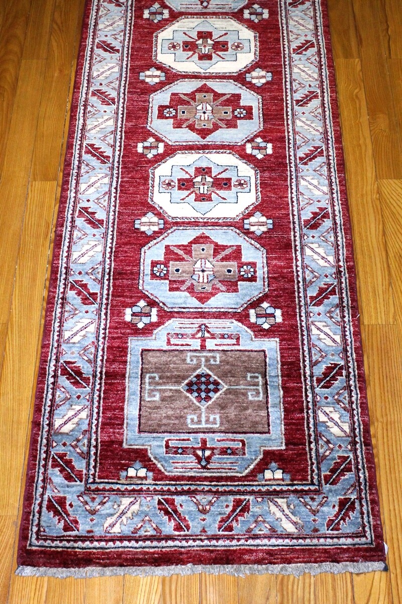 Chobi rugs are traditionally produced in many regions of Pakistan. The word "chobi" is from the Farsi word "chob" which means wood, referring to the source of its natural dyes. Our Chobis tend to have large geometric floral patterns. They are all hand-knotted with hand-spun wool spun primarily by a drop spindle. Their natural dyes are made entirely from hand-gathered fruits, vegetables, roots, tree barks and dried shells, making Chobis the most labor-intensive of all of our tribal carpets.