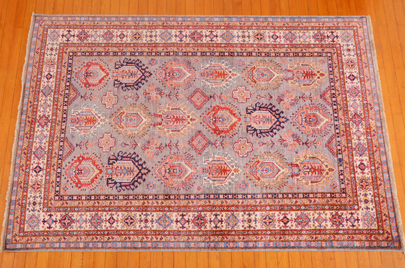 Kazaks are known for their indigo blues, reds and ivories, as well as their casual and warm appearance. Our Kazak rugs are almost entirely naturally-dyed, however, Kazak natural dyes are commercially farmed natural dyes (such as indigo and cochineal) and are therefore less labor intensive for our artisans than hand-gathered natural dyes. The reason for the phrase "almost entirely naturally-dyed" is because some artisans choose to augment their natural dyes with some commercially-available dyes in order to create the precise color they desire. The wool in Kazaks, like the wool found in Chobis and Gabbehs, is hand spun using a drop-spindle.
